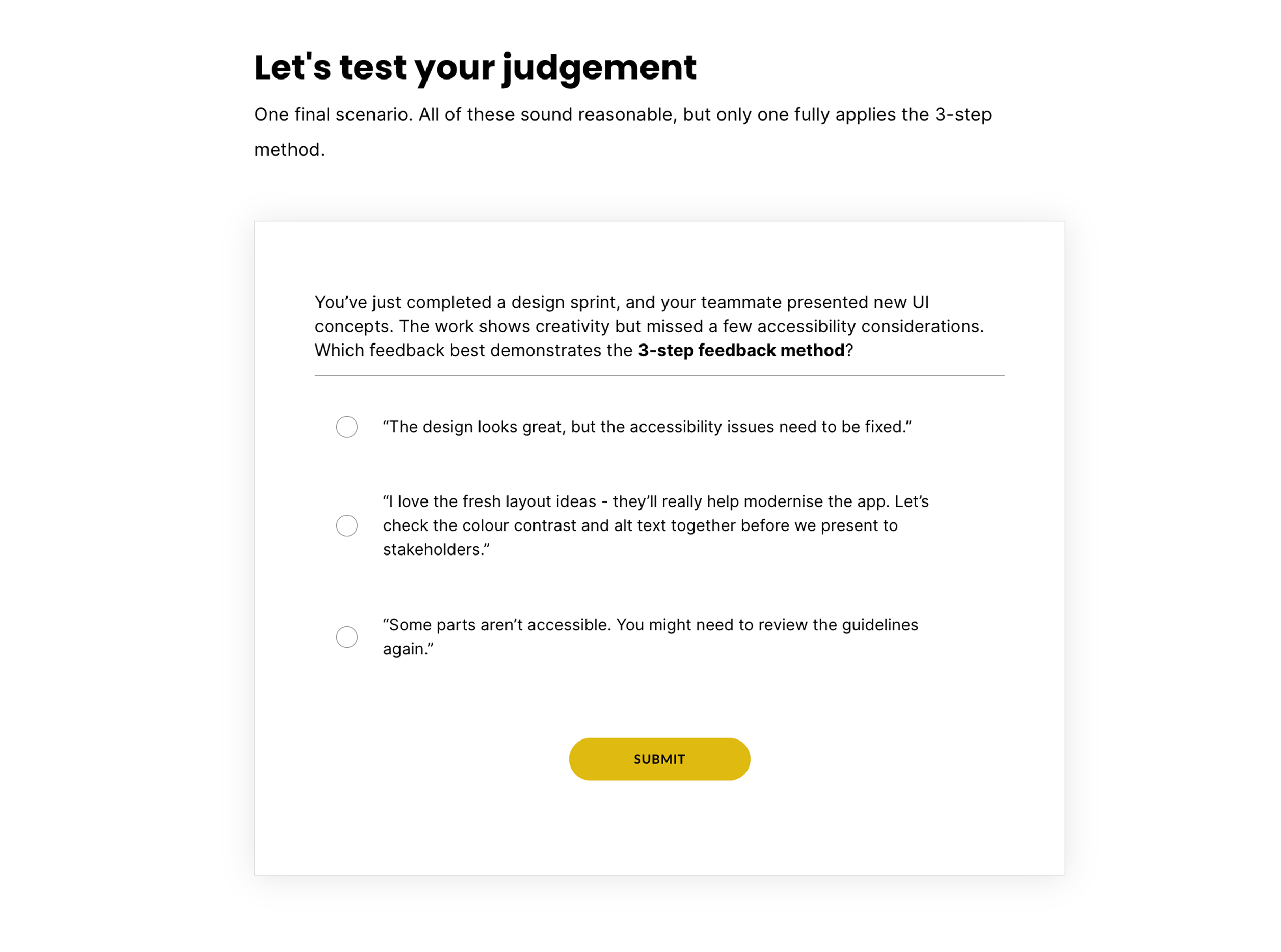 I approached this as a behavioural skill challenge - designing a simple, repeatable structure that helps people move from vague feedback to clear, actionable conversations.
