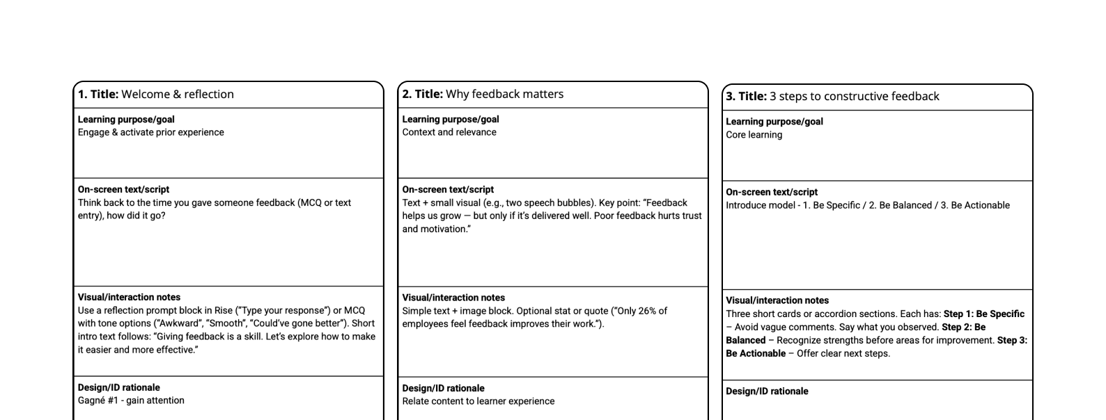Storyboard used to define pacing, chunking, and transitions before building the module