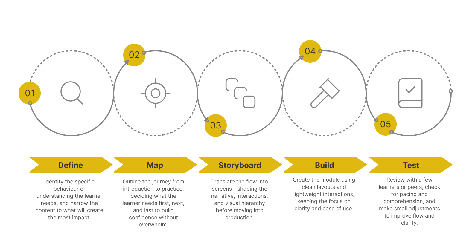 Early design decisions were lightly guided by Gagné’s principles - starting with attention-grabbers, breaking concepts into small steps, and reinforcing learning through quick practice activities.